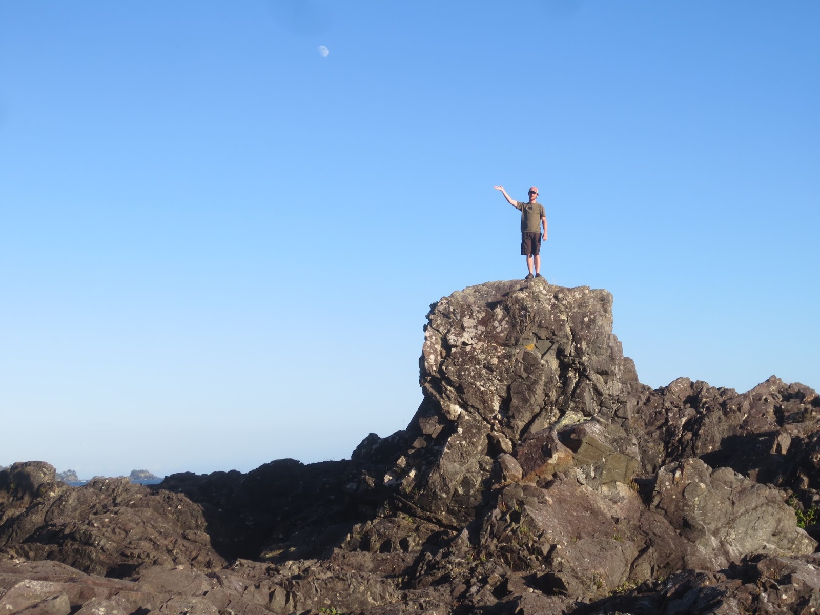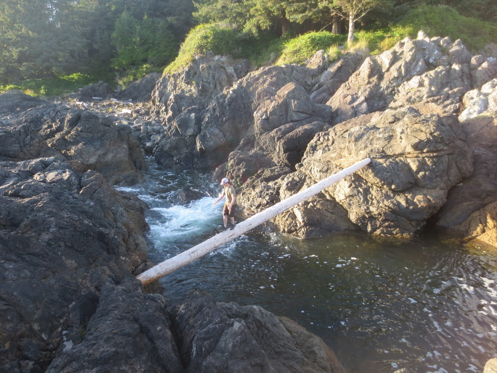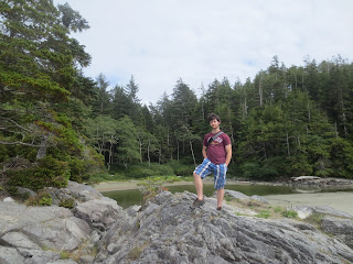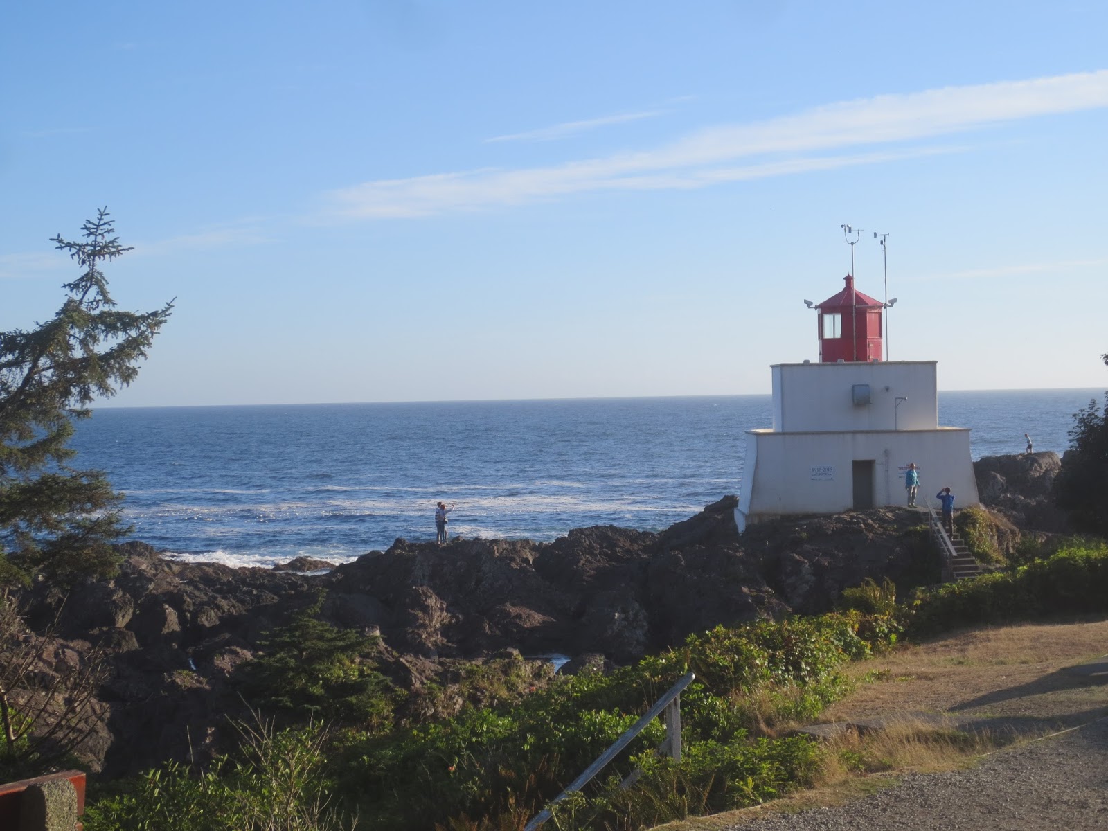 Exhausted, but happy we caught a ride back to our car and drove into Ucluelet for dinner. Before we decided on a restaurant we stopped in at the lighthouse to play on the rocks. We realized later that everyone in town has a channel with a live feed of the lighthouse. Later at dinner we watched other tourists on the TV walk around the lighthouse as the patrons before us no doubt watched us.