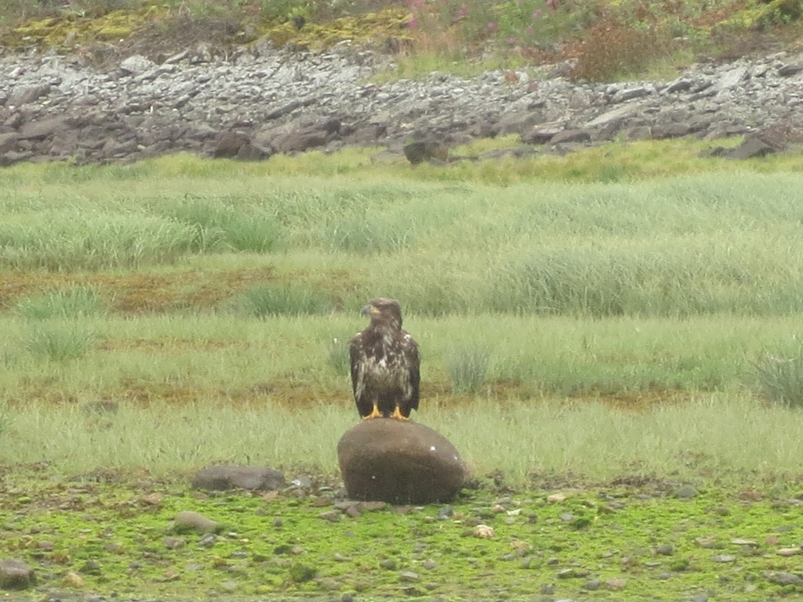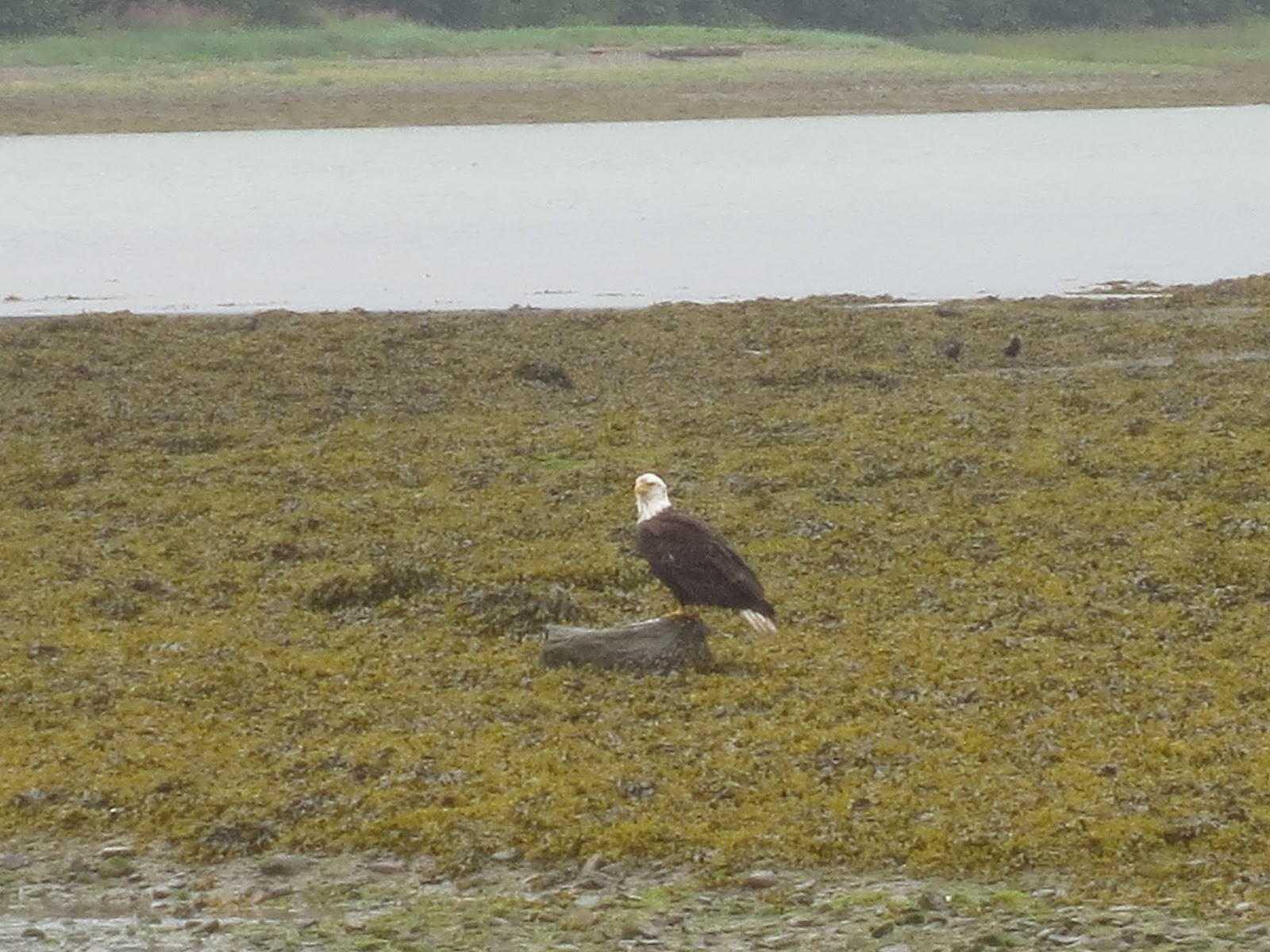 It's spawning season and tons of salmon are waiting out in the bay to spawn back up the ladder to where they were artificially fertilized and raised. With so many splashing around in shallow water, it's easy pickings for fishermen and other predators. At a marsh just a few blocks down from the hatchery, we saw five or six eagles waiting to grab some salmon from the buffet as well as a number of other larger birds of prey that we couldn't identify.