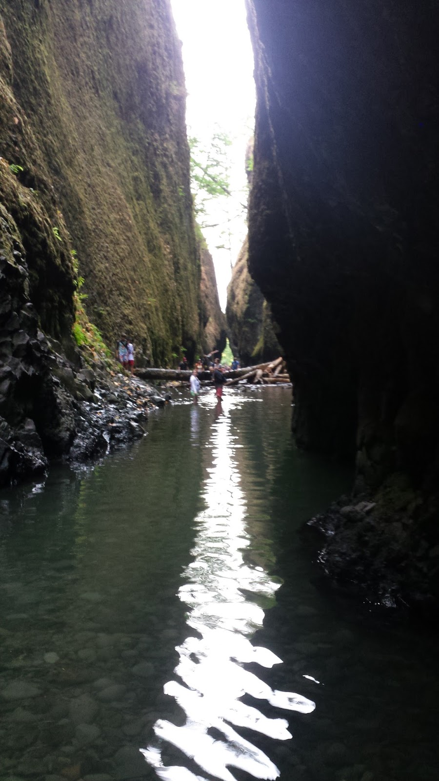 We had spent so much more time hiking than we intended to that we were almost ready to call it quits for the day when we stopped at Oneonta Gorge and saw a group of people climbing over a pile of fallen logs. Out of curiosity Bill and I followed them. On the other side of the pile of fallen logs was a stream with waist deep water. I had my hiking shoes on and had forgotten my bathing suit, so Bill in his shorts and sandals, went ahead with the camera to explore the hidden waterfall beyond.